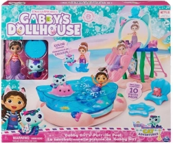 Potopite se v svet GABBY’S DOLLHOUSE s tematskim bazenskim setom, ki prinaša čarobno vodno zabavo. GABBY nataknite sirenski rep, se povzpnite po lestvi na tobogan in aktivirajte spreminjanje barve repov s toplo vodo z ljubko hobotnico–pršilko. Odkrijte skrivni portret Muckove sestrice v velikanski školjki in odprite Mačjo pošto s skritim presenečenjem.