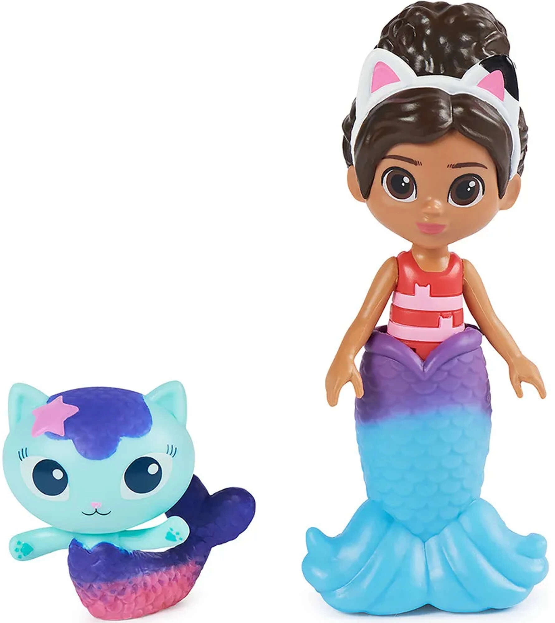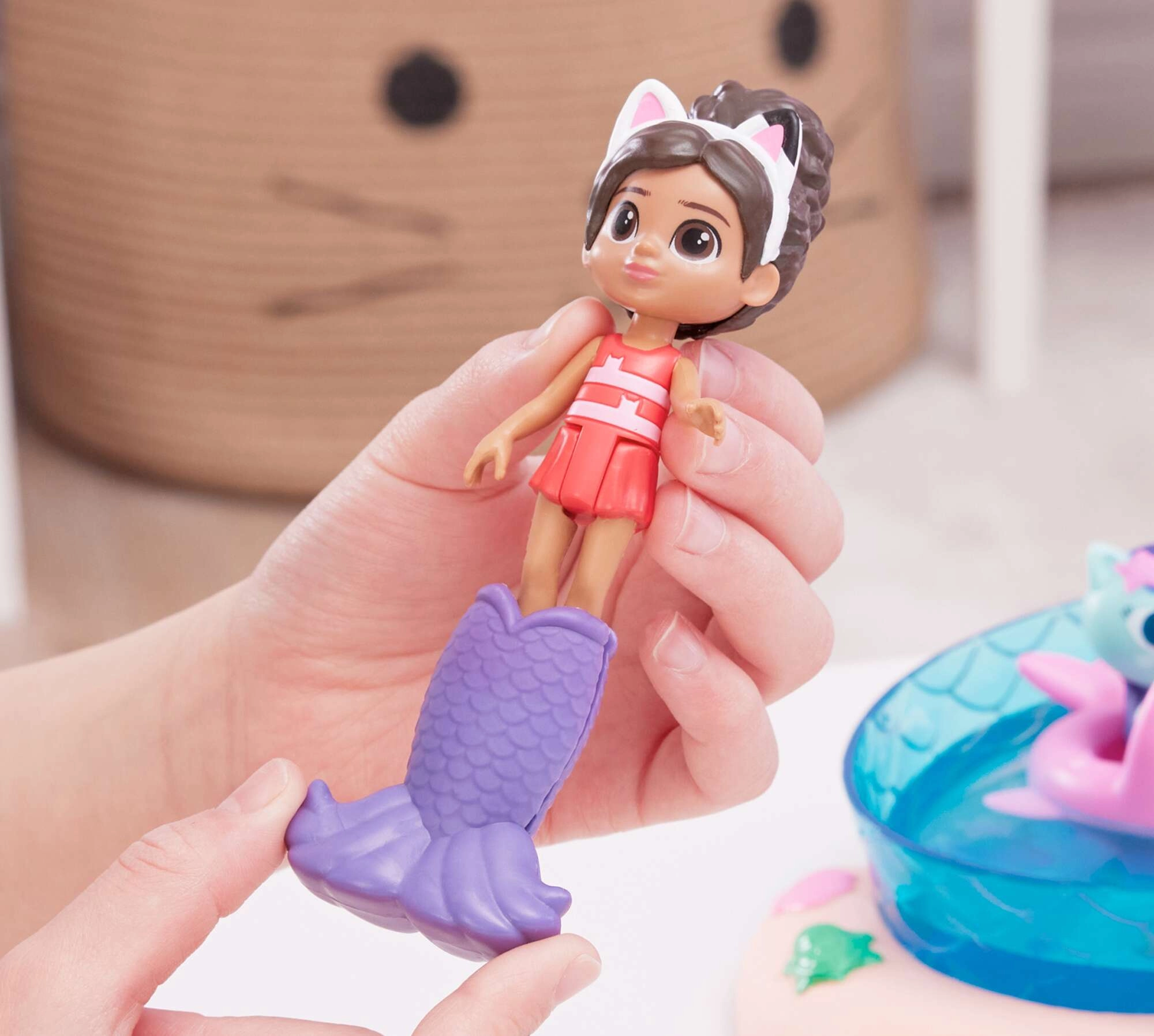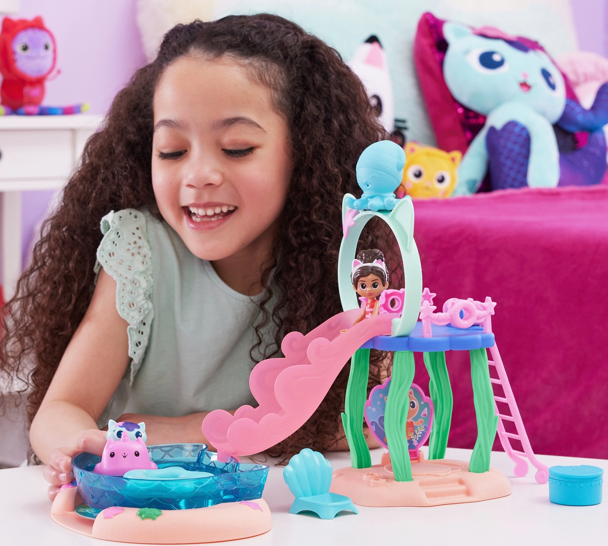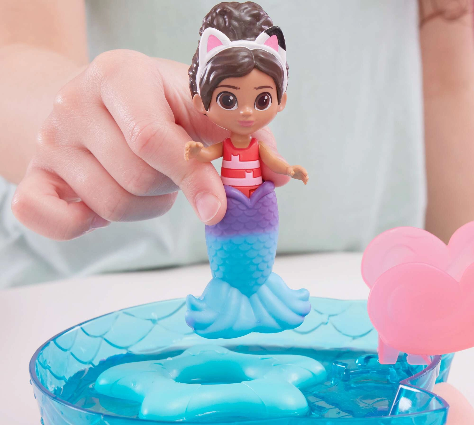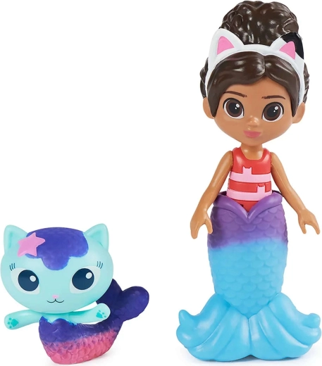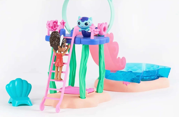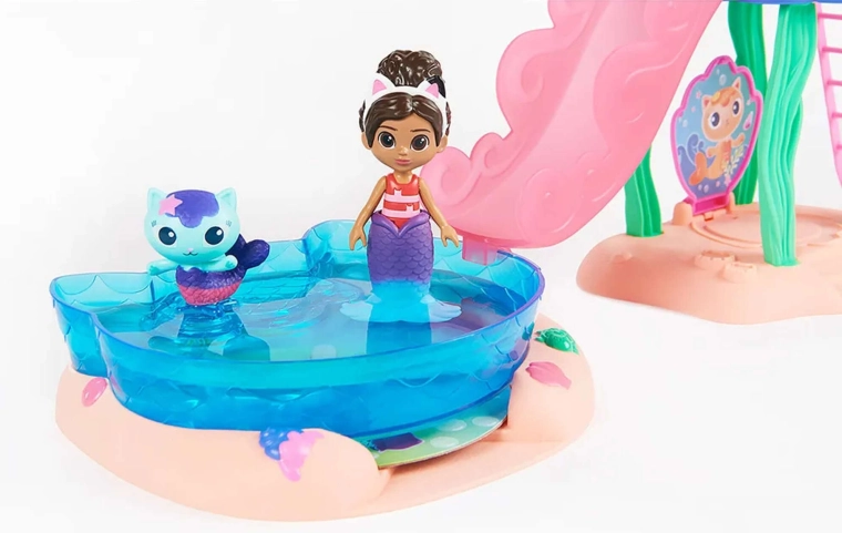 Vstopite v svet Gabinega mačjega domka s super bazenskim setom, kjer se Gabi in Sirenko spustita po rožnatem toboganu naravnost v moder bazen. S pršilom v obliki hobotnice aktivirajte čarobno spremembo barv na njunih repnih plavutih in odkrijte skrito presenečenje v veliki školjki pod toboganom.