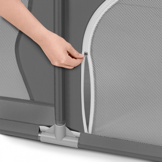 Za starše je Willow praktičen pomočnik: materiali se zlahka čistijo, montaža in demontaža sta možni brez orodja, po zlaganju pa zavzame minimalno prostora. Dve stranski zadrgi imata drsnik na zunanji strani, zato nadzor nad vhodi ohranja izključno odrasla oseba. Stabilnost povečujejo jeklene cevi (Ø 2,5 cm), penasto oblazinjenje zgornjih cevi in 4 priseski v vogalih za zanesljiv oprijem.