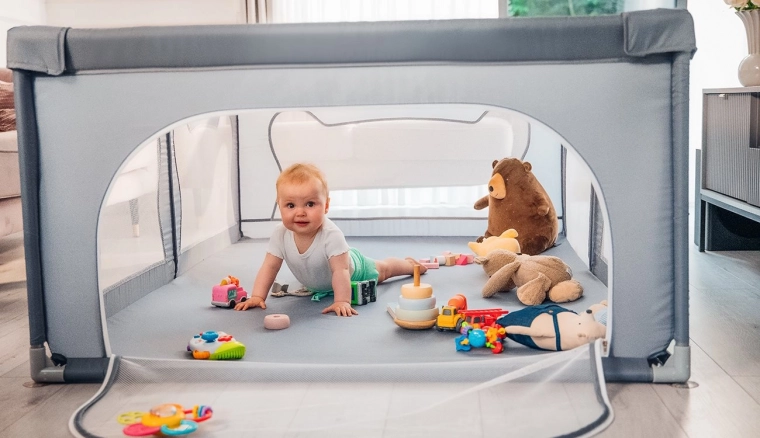 Stajica ponuja varno mesto za igro brez motečih elementov v notranjosti – vsi konstrukcijski deli so na zunanji strani. Mehke mrežaste stranice omogočajo otroku vaditi vstajanje, prve korake ali obračanje z minimalnim tveganjem, hkrati pa zagotavljajo odlično vidljivost za starše. Višje in čvrste stene preprečujejo samostojen izhod, zato ima otrok čist in zaščiten prostor za vsakodnevno zabavo.