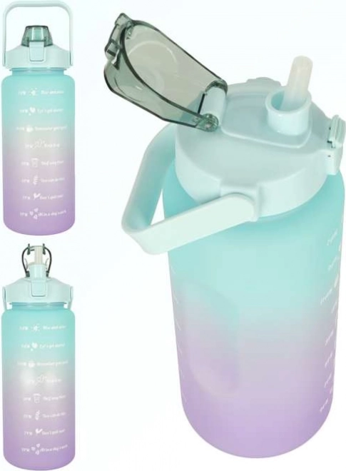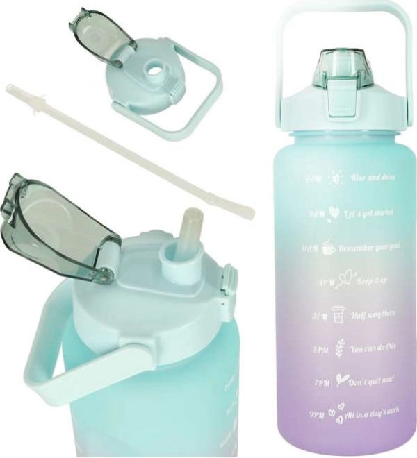 Športna steklenica za vodo 2 l s praktično slamico, tesnim pokrovčkom in motivacijsko časovno lestvico vam pomaga vzdrževati pitni režim doma, v fitnesu in na poti. Široko grlo olajša čiščenje ter dodajanje ledu ali sadja, udoben ročaj zagotavlja enostavno prenašanje.