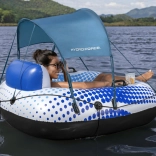 Uživajte v poletju z največjim udobjem z napihljivim obročem BESTWAY s strešico in naslonom. Ta trpežen PVC obroč v modro-beli barvi ponuja prijetno senco, udobno oporo za hrbet in držalo za pijačo za popolno sprostitev na vodi. Zahvaljujoč varnostnemu ventilu in sistemu CLASP 'N GO ga lahko preprosto povežete z drugim obročem.