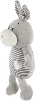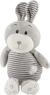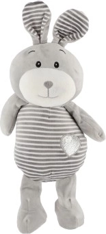 Ta siv črtasti zajček z ljubkimi detajli in srčkom na trebuščku otrokom prinaša občutek varnosti in udobja. Izdelan je iz prijetnega, mehkega materiala, ki vabi k objemu in je nežen tudi do najmlajših dojenčkov.