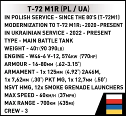Komplet COBI zvesto prikazuje moderniziran tank T-72M1R, uporabljen na Poljskem in v Ukrajini. V merilu 1:35 se odlično ujema z drugimi modeli serije Armed Forces. Zahvaljujoč novemu specialnemu elementu za značilna tekalna kolesa, vrtljivi kupoli, premičnemu topu in funkcionalnim gosenicam boste uživali tako pri sestavljanju kot pri igri in razstavljanju.