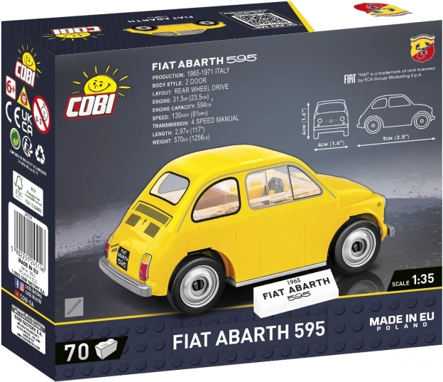 Ta podroben model slavnega Fiata ABARTH 595 je v celoti izdelan iz kock COBI in izstopa po visoki kakovosti izdelave. Namesto nalepk uporablja odporne, neobledljive potiske, ki ostanejo lepi tudi pri intenzivni igri. Končni model meri približno 9 cm v dolžino, priložen je tudi napisni ščit z imenom vozila.