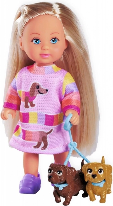 Ljubka punčka Evi Love se odpravi na sprehod z dvema prisrčnima jazbečarjema. V paketu najdete tudi povodec, s katerim lahko Evi svoje kužke varno vodi. Idealna igrača za ljubitelje živali in ustvarjalno igro.