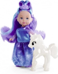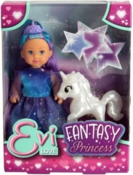 Odkrijte čarobni svet s punčko Evi Love v vlogi fantazijske princese. Oblečena je v čudovito modro‑vijolično obleko, ima ujemajoče pisane lase, v kompletu pa jo spremlja prikupen biserna enorog za neskončne domišljijske igre.