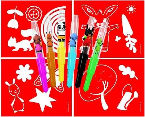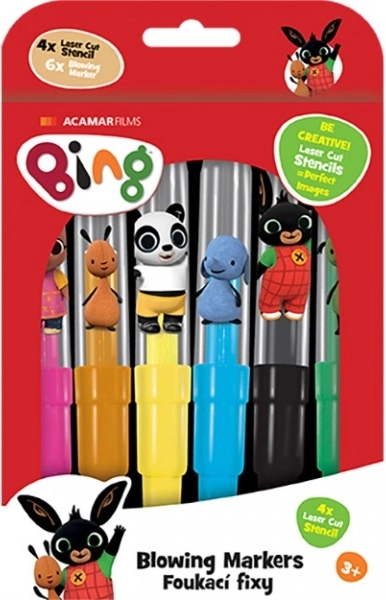 Komplet pihalnih flomastrov BING bo razveselil vse male umetnike. Šest pisanih barv in tematske šablone omogočajo enostavno ustvarjanje izvirnih slik s priljubljenimi liki. Preprosto pihanje skozi flomaster ustvari nežne prehode in razpršene učinke brez nereda.
