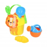 Barvit plastičen komplet za pesek za male graditelje olajša gradnjo gradov in peciv iz peska v hipu. Idealen za peskovnik, k vodi in na vrt. Vsebuje vse potrebno: vedro 15 cm, lopatko, grabljice, zalivalko in 2 modelčka. Primerno za otroke od 3 let.