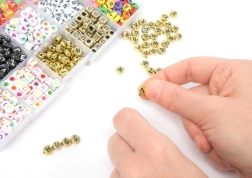 Set za nizanje kroglic s črkami ABC – set vsebuje 15 vrst kroglic za nizanje s črkami. Shranjeno v praktičnem škatlastem ohišju z zapiranjem.