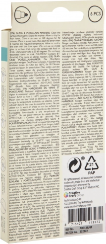 Marker za porcelan in steklo – s tem markerjem lahko rišete na porcelan in steklo. Barve so vodoodporne. Primerno za pomivanje v pomivalnem stroju. Navodila so na embalaži izdelka.