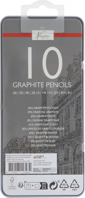 Komplet 10 grafitnih svinčnikov pokriva celoten razpon za kreativno delo: od mehkih za bogate sence in ekspresivne poteze do trdih za fine detajle in tehnične črte. Priložen kovinski etui ščiti svinčnike pri prenašanju in ohranja red v ateljeju in v šoli.