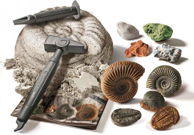 Vrnite se v čas in postanite mali paleontolog. Kompakten izkopni blok skriva verne posnetke prazgodovinskih fosilov, kot so amoniti in trilobiti, ter tudi drobne minerale. Odtaljujte mavčni »kamen« s pomočjo vzdržljivega plastičnega kladivca in dleta ter opazujte, kako se pred vašimi očmi pojavljajo zakladi davnih dob.