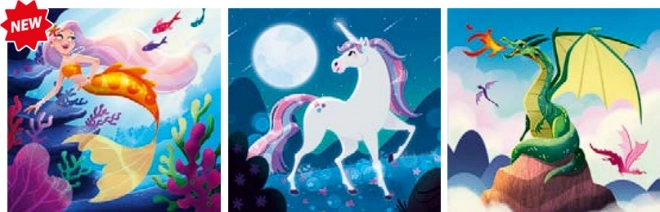 Komplet Clementoni prinaša zabavno sestavljanje z motivom fantastičnih bitij, ki spodbujajo domišljijo in ustvarjalnost. Trije samostojni puzzli z enakim številom koščkov in merami so primerni tudi za mlajše otroke, pri čemer krepijo zbranost in fino motoriko.