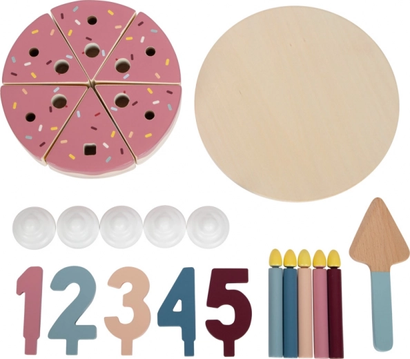 Lesena rojstnodnevna torta za rezanje small foot Tasty bo otroško sobo spremenila v veselo praznovanje. Šest realističnih kosov z rožnato »kremo« in posipom se s pomočjo ježkov združi v celo torto, ki jo otroci zlahka »narežejo« s priloženo lopatico. Odstranljive svečke, kremice in številke 1–5 vabijo k domišljijskemu okraševanju ter učenju števil in barv.