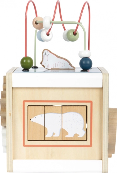 Ta večnamenska motorična kocka z motivi arktičnih živali (polarni medved, tjulenj, mrož in druge) je premišljena izobraževalna igrača za otroke od 12 mesecev dalje. Z dvema krogličnima vodiloma, vstavljanko oblik, premičnimi labirinti, vrtljivimi ploščicami in zobniki otroci razvijajo koordinacijo oko–roka, potrpežljivost in prostorsko zaznavanje. Odstranljiv pokrov omogoča preprosto shranjevanje delov v notranji prostor.