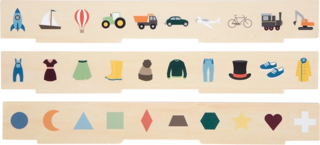 Pametna lesena igrača za otroke od 3 let, ki združuje sortiranje, vstavljanje in učenje besed. Vsebuje tri dvostranske panele in 60 slikovnih žetonov na teme promet, živali, številke, oblike, oblačila, sadje in zelenjava. Med igro otroci razvijajo fino motoriko, prepoznavanje barv in oblik ter si naravno širijo besedni zaklad. Varno shranjevanje zagotavlja lesena škatla z 10 predelki in elastičnimi zapirali – idealno tudi za na pot.
