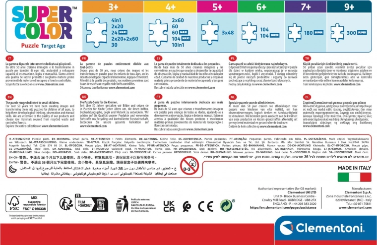 Dve otroški sestavljanki z enakim številom koščkov in enakimi dimenzijami. Kolekcija Puzzle SuperColor – serija, zasnovana posebej za otroke, jim pomaga razvijati ročne spretnosti in opazovalne sposobnosti. Kakovostni materiali in ekskluzivna tehnika tiskanja zagotavljajo trajno lepe, žive in sijoče barve.