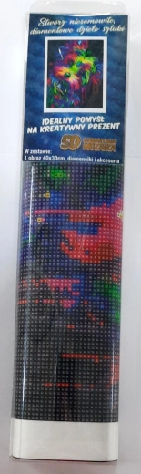 Vsebina pakiranja: platno s predtiskano sliko, pero za nanašanje kamnčkov, posodica za stresanje kamnčkov, vosek za lepljenje, komplet barvnih kamnčkov.