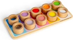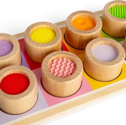 Ta čudovita senzorična plošča je odličen način, kako otroke seznaniti z različnimi teksturami in barvami. Vsebuje leseno ploščo z barvnimi odprtinami in enajst vstavnih delov, vsak s svojo edinstveno površinsko obdelavo, od rebrastega silikona do mehke klobučevine. Ta igrača ne le da pomaga v razločevanju različnih tekstur, ampak tudi podpira koordinacijo roke in očesa.