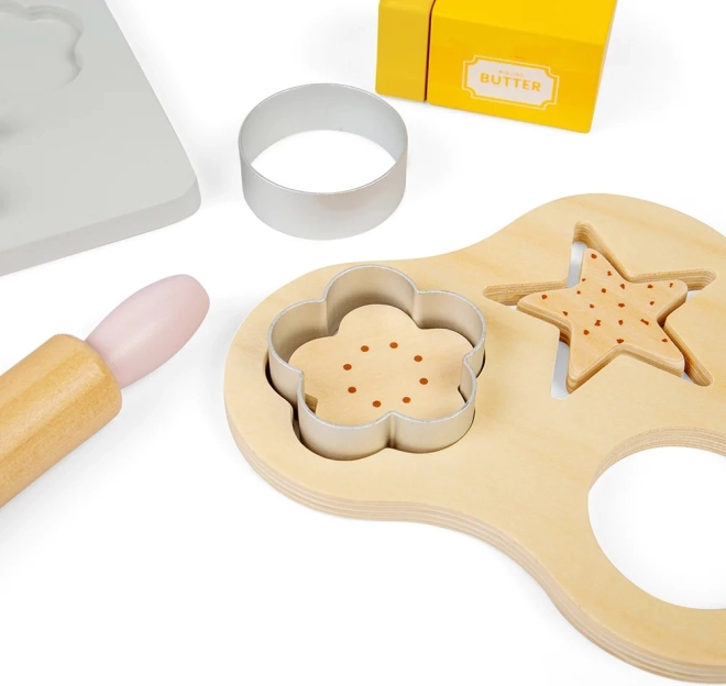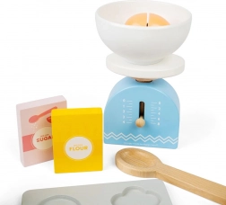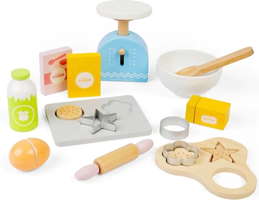 S tem otroškim lesenim kompletom za peko boste otrokom pričarali ure zabave in hkrati podprli njihovo domišljijo. Komplet vključuje lesen pekač, tehtnico, modelčke, valjar, skledo, maslo, jajca, moko, sladkor in mleko. Varnost v kuhinji se bodo naučili na igriv in zabaven način.