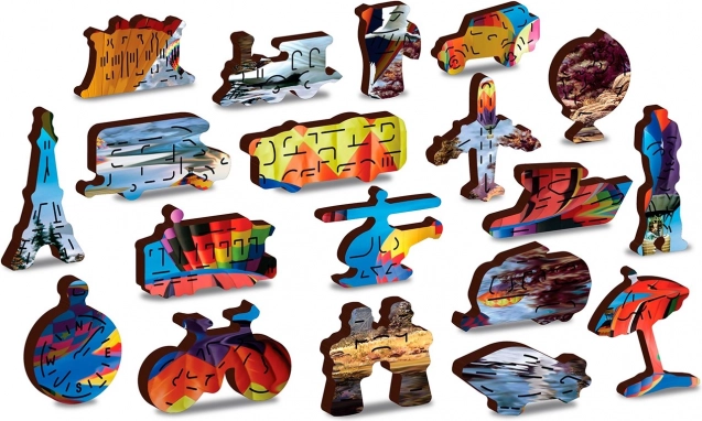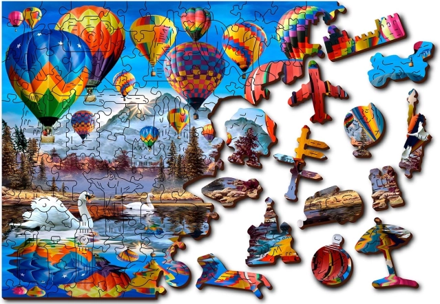 Elegant izziv in zabava za ljubitelje sestavljank. Lesena sestavljanka s motivom toplozračnih balonov ponuja edinstveno izkušnjo zahvaljujoč 61 posebno oblikovanim koščkom v oblikah živali, zgradb in predmetov. Nekatere lahko postavite kot majhne figurice, kar sestavljanko spremeni v odlično darilo in stilno dekoracijo.