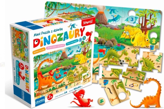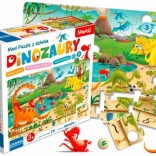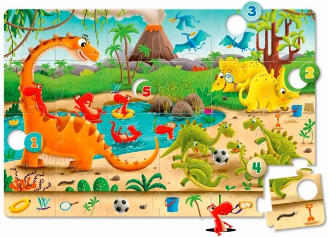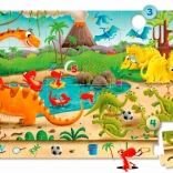To pa je šele začetek zabave. Ta sestavljanka ne le uri fino motoriko, temveč tudi spodbuja pogovor, pri katerem si vaš otrok bogati besedni zaklad z opisovanjem tega, kar vidi na sliki, in z odgovarjanjem na preprosta vprašanja. Iskanje poudarjenih predmetov uri opazovalne sposobnosti, s čimer preverja otrokovo zaznavnost, prostor za žetone pri vsaki skupini dinozavrov pa jim pomaga naučiti se šteti do 5.