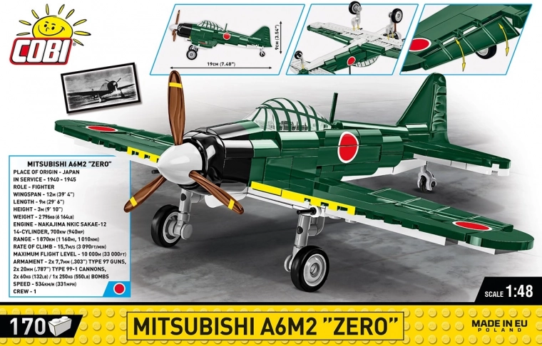 Mitsubishi A6M2 Zero je lahko prepoznavno japonsko lovsko letalo iz druge svetovne vojne, ki se je proslavilo z udeležbo v ključnih bitkah, kot sta napad na Pearl Harbor in bitka pri Midwayu. Set vsebuje 170 visokokakovostnih kock, ki vam omogočajo zgraditi podroben model tega legendarnega letala z odstranljivim pristajalnim podvozjem.