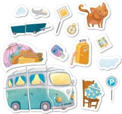 Barviti motivi, kot so mačka, minibusek, kovček, kompas in prometni znaki, navdihujejo otroke k ustvarjanju lastnih prizorov ter razvijajo domišljijo in izražanje.
