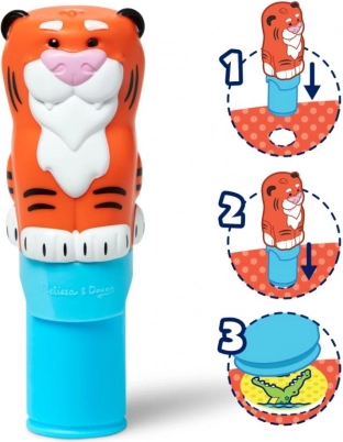 Žig v obliki razigranega tigra omogoča otrokom ustvarjanje čudovitih nalepk s pritiskom na en sam gumb. Dovolj je, da žig pritisnete na katerokoli površino in pojavi se barvita nalepka z motivi džungle. Set vključuje do 300 nalepk z motivi tigra in drugih živali iz džungle, zaradi česar je žig odlična izbira za otroke od 3. leta dalje.