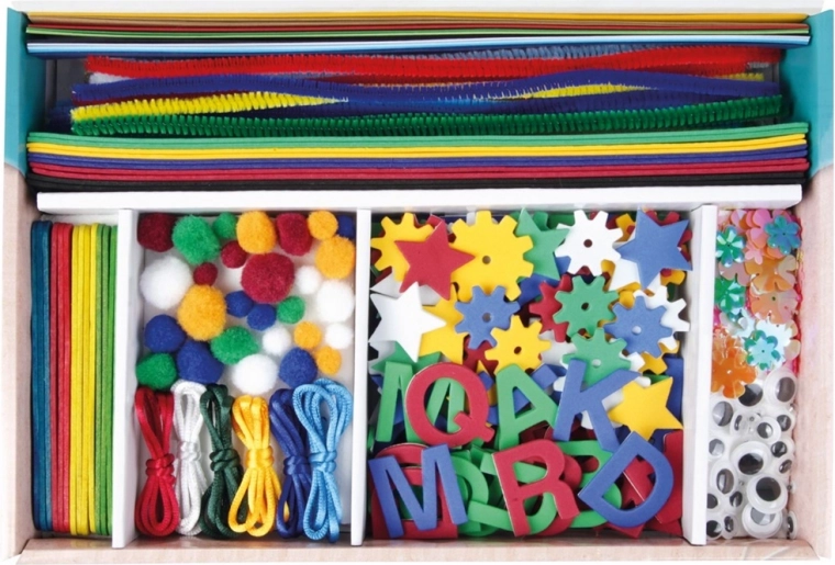 Odkrijte bogat ustvarjalni set za otroke z več kot 400 kosi materiala v praktičnem kovčku. Ta moder kovček LENA spodbuja domišljijo, fino motoriko in ustvarjalnost – od papirjev, penaste gume, puhastih žičk, gibljivih oči do cofkov, palčk za sladoled in gumbov. Idealno za otroke od 5 let in skupno družinsko ustvarjanje.