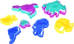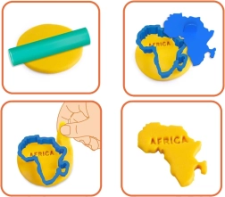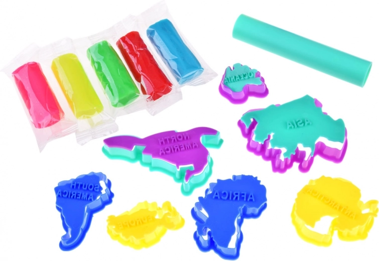 Komplet vsebuje vse potrebno: modelirno maso v petih barvah, 7 modelčkov v oblikah celin, 7 žigov z imeni celin in valjar. Dovolj je, da modelirno maso razvaljate v tanjši list in s pomočjo izrezovalnikov ustvarite izbrane celine.