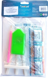 Ta komplet spodbuja zbranost, potrpežljivost in fino motoriko. Postopek je preprost: v aplikacijsko pero zajamete vosek, kamenčke stresete v posodico in jih po legendi prenašate na samolepilno platno. Lepljivo plast odkrivajte postopoma, da bodo kamenčki dobro držali in bo delo čisto.