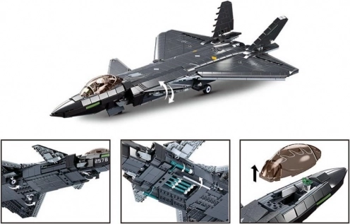 Z več kot tisoč kosi boste uživali v premišljeni konstrukciji: odstranljiv kokpit za pilota, zložljiva kolesa z odpirajočim se podvozjem in integrirani izstrelki podpirajo avtentičen videz. Sprednja bočna krilca in zadnja zgornja krila z možnostjo nagibanja modelu dodajo dinamiko, kot da je pripravljen na vzlet.