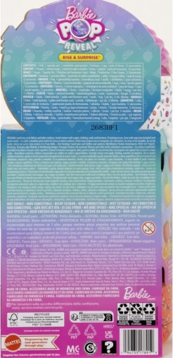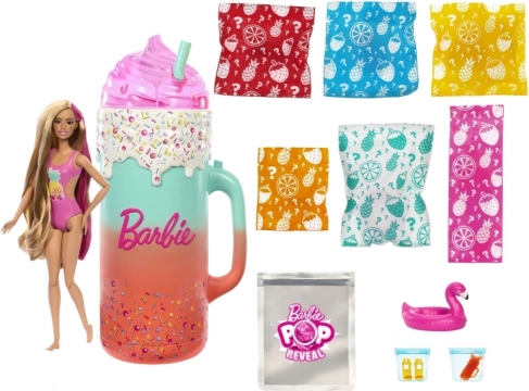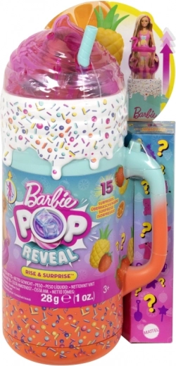 Odkrijte svet presenečenj z darilnim setom Barbie Pop Reveal Tropski smoothie. Čaka vas kar 15 presenečenj, vključno z dišečo punčko Barbie z ličili, ki spreminjajo barvo, dišečim ljubljenčkom, oblikovalnim peskom, stilskim oblačilom in vrsto dodatkov za ustvarjalno čutno igro.