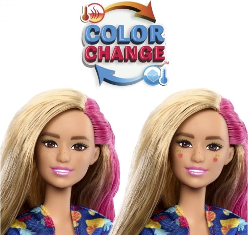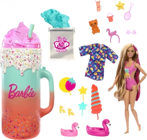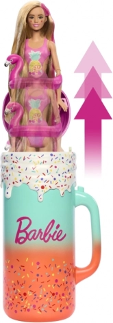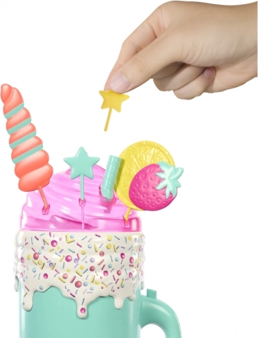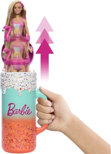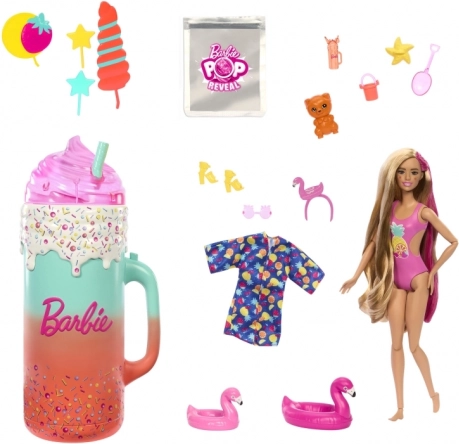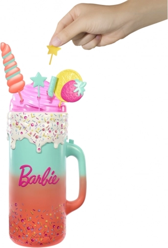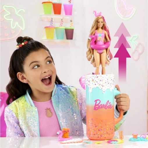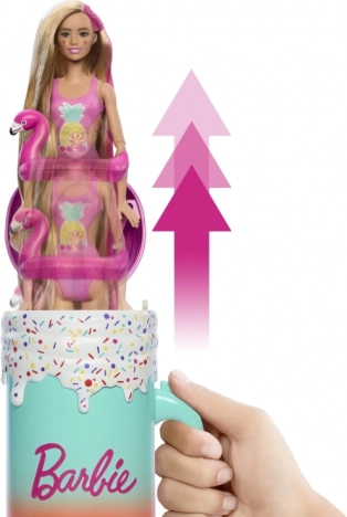 Dovolj je, da dvignete pokrov barvnega »kozarca« in pritisnete gumb na ročaju – punčka Barbie se vpadljivo pomakne navzgor in šov se lahko začne. Odpirajte večkrat uporabne »ledene kocke« in vrečke s presenečenjem, odkrijte prikupnega dišečega ljubljenčka, plažne dodatke in oblačila s tropskimi motivi. Z barvno preobrazbo ličil s pomočjo hladne in tople vode so zagotovljeni dodatni igralni trenutki.