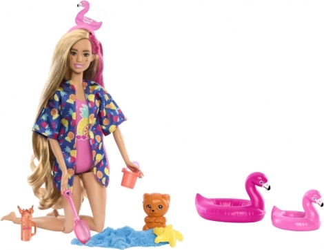 Set prinaša mešanico mode, plaže in čutnega odkrivanja: oblikovalni pesek z lopatko, vedrčkom in modelčkom spodbuja ustvarjalnost, medtem ko flamingovi dodatki in kopalke z sadnim motivom poudarijo poletno vzdušje. Idealen dar za otroke od 3 let, ki obožujejo presenečenja in domišljijsko igro.