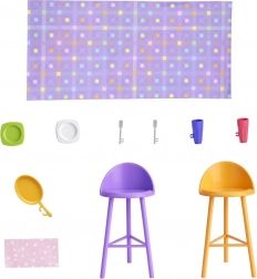 V kompletu je 11 dodatkov, vključno s posodo, dvema stolčkoma, brisačko in odejico. Izvlečna mizica v kuhinji razširi možnosti igre.