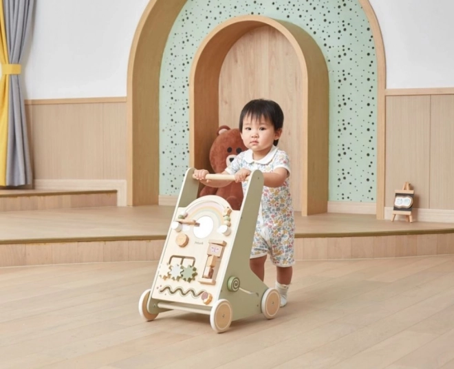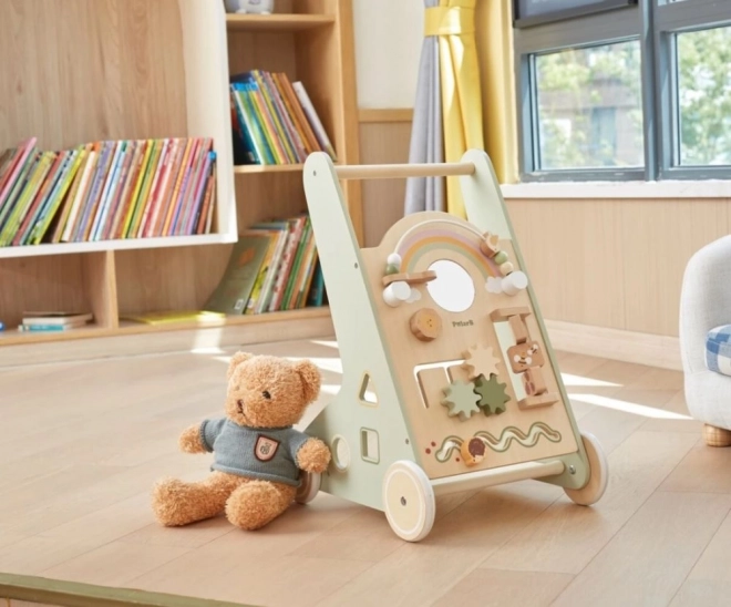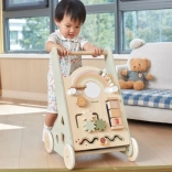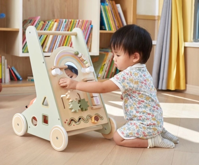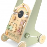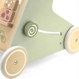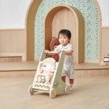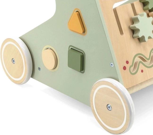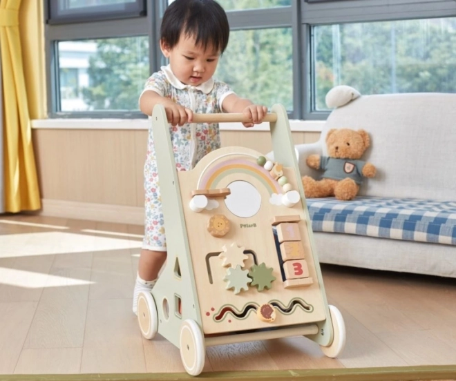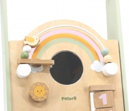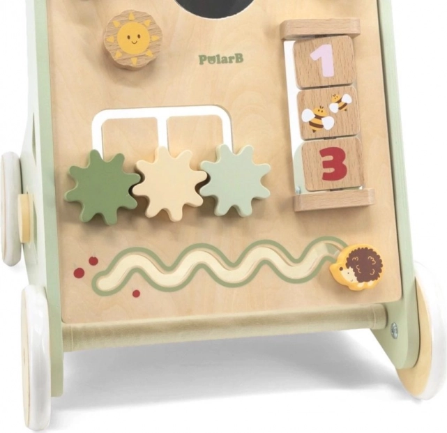Leseni potisni hojnik PolarB Viga je zasnovan tako, da otroke varno spremlja pri njihovih prvih korakih in jih hkrati motivira k odkrivanju. Sprednji panel ponuja številne aktivnosti – od vrtečih se zobnikov, preko drsnih labirintov do razvrščanja oblik in ogledalca, ki naravno razvijajo čute in logično razmišljanje.