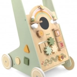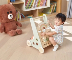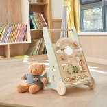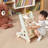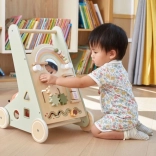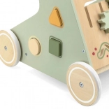 Robustna lesena konstrukcija in gladka kolesca pomagajo otroku varno in samozavestno vaditi hojo ter ravnotežje.