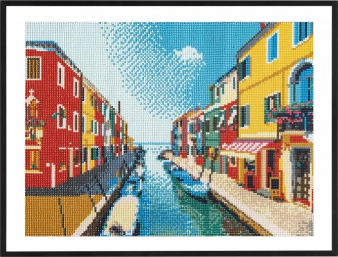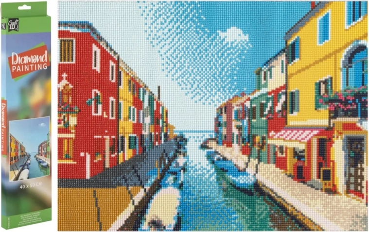 Diamantno slikanje je ustvarjalna zabava za vsakogar – drobne barvne kamenčke postopoma nameščate na predtiskano platno s pomočjo aplikacijskega peresa. Motiv romantičnega vodnega kanala zažari v bleščanju kamenčkov in se spremeni v izvirno dekoracijo vašega doma.