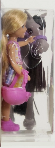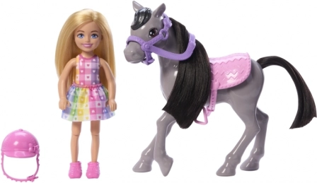 Igralni set Barbie Chelsea na poniju prinaša otrokom veliko zabave in domišljije. Chelsea si nadene varnostno rožnato čelado, sede v udobno rožnato sedlo in se zahvaljujoč upogljivim kolenom ter stremenom odpravi na stilski izlet. Sivi ponij z vijolično uzdo, mehko grivo in repom je kot ustvarjen za nego in nežno božanje.