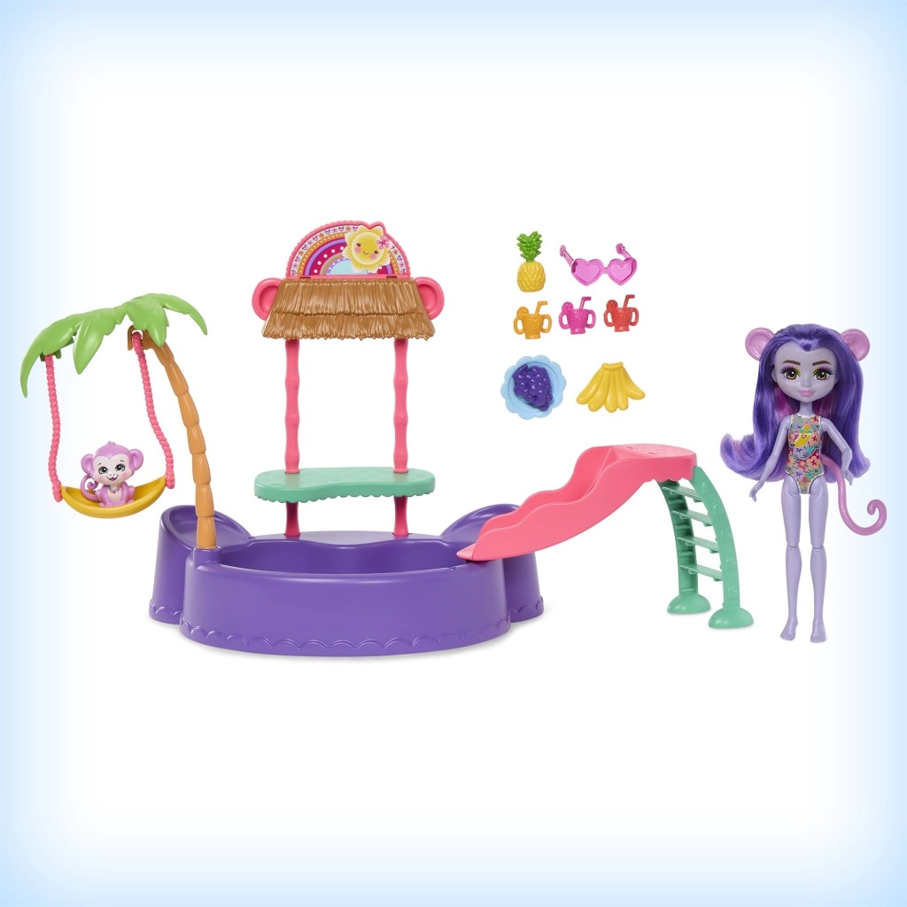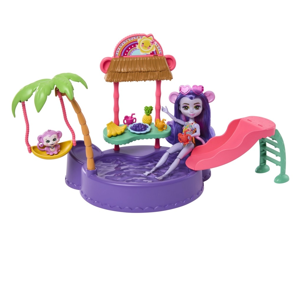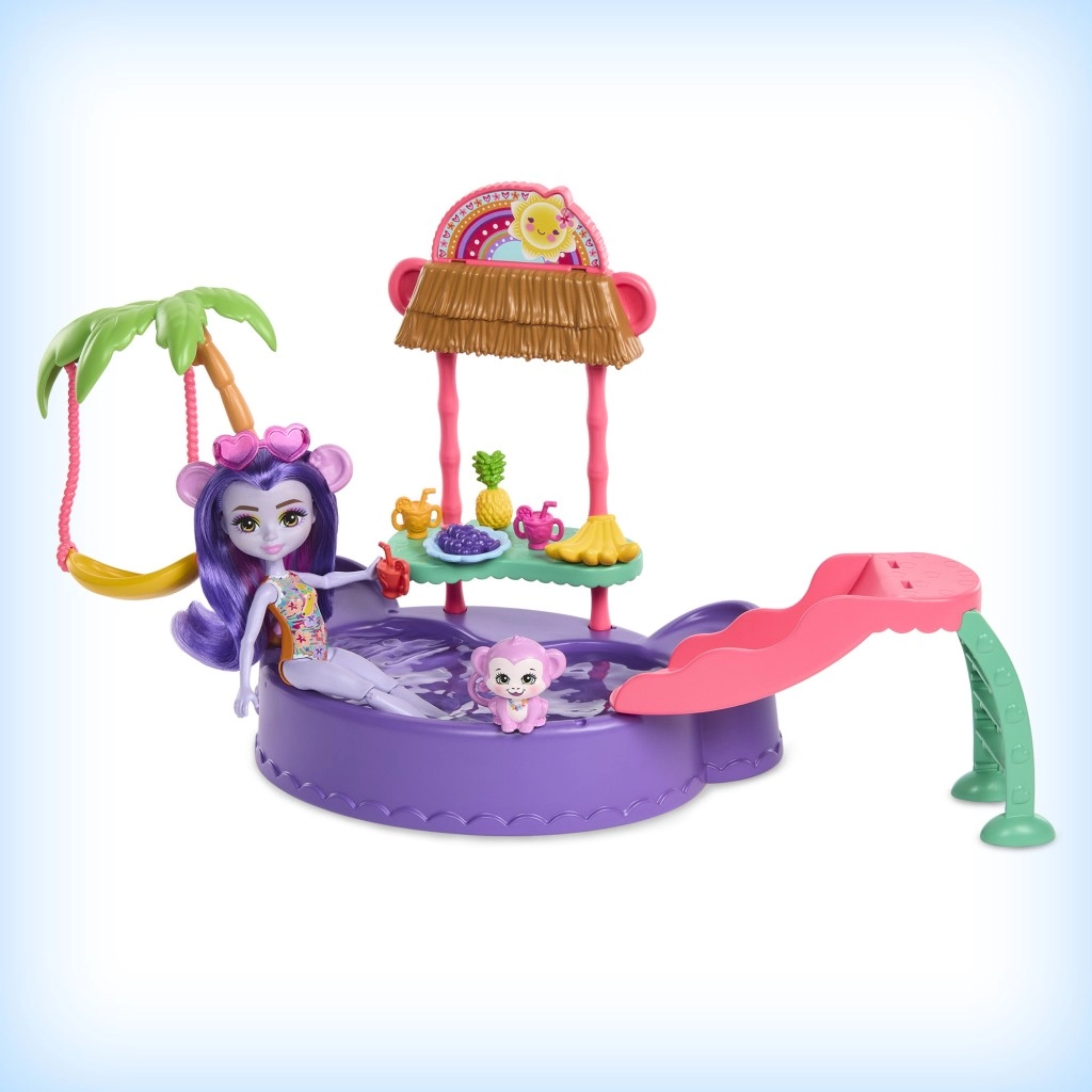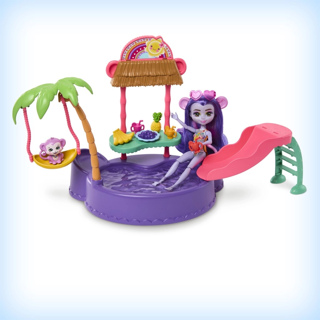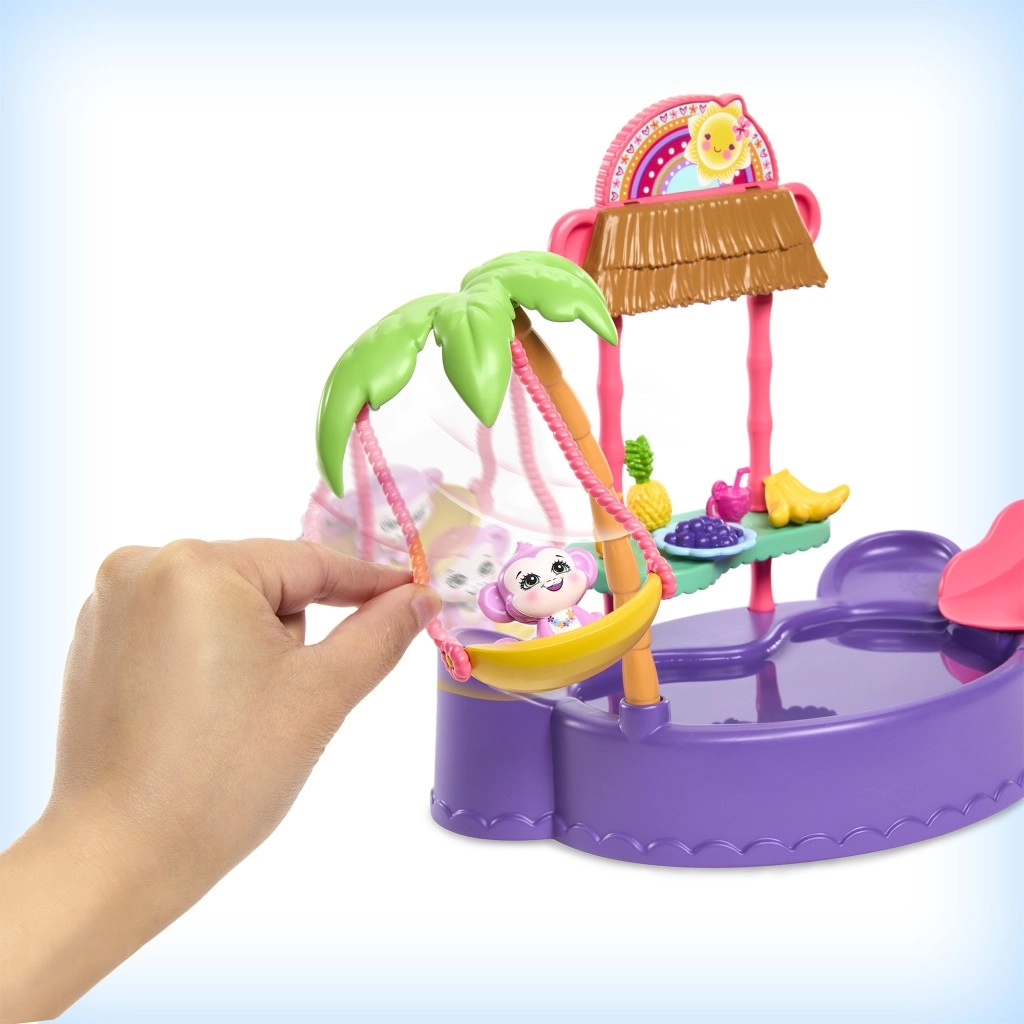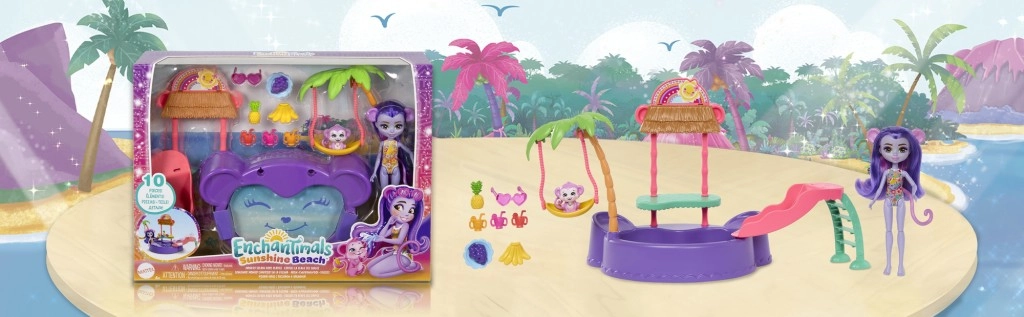 Ta barvit igralni set ENCHANTIMALS prinaša vzdušje plaže naravnost v otroško sobo. Punčka z vgrajenimi kopalkami in sončnimi očali v obliki srčka je pripravljena na dan, poln sonca, kopanja in dobrot s stojnice. Opička se lahko ziba na palmi ali se spušča po toboganu naravnost v bazenček.