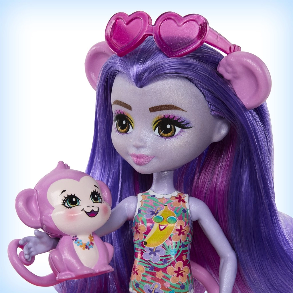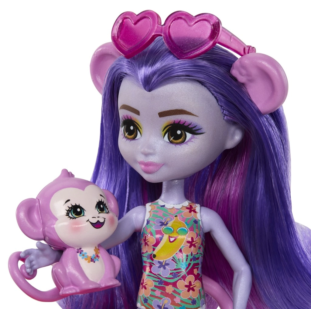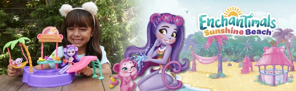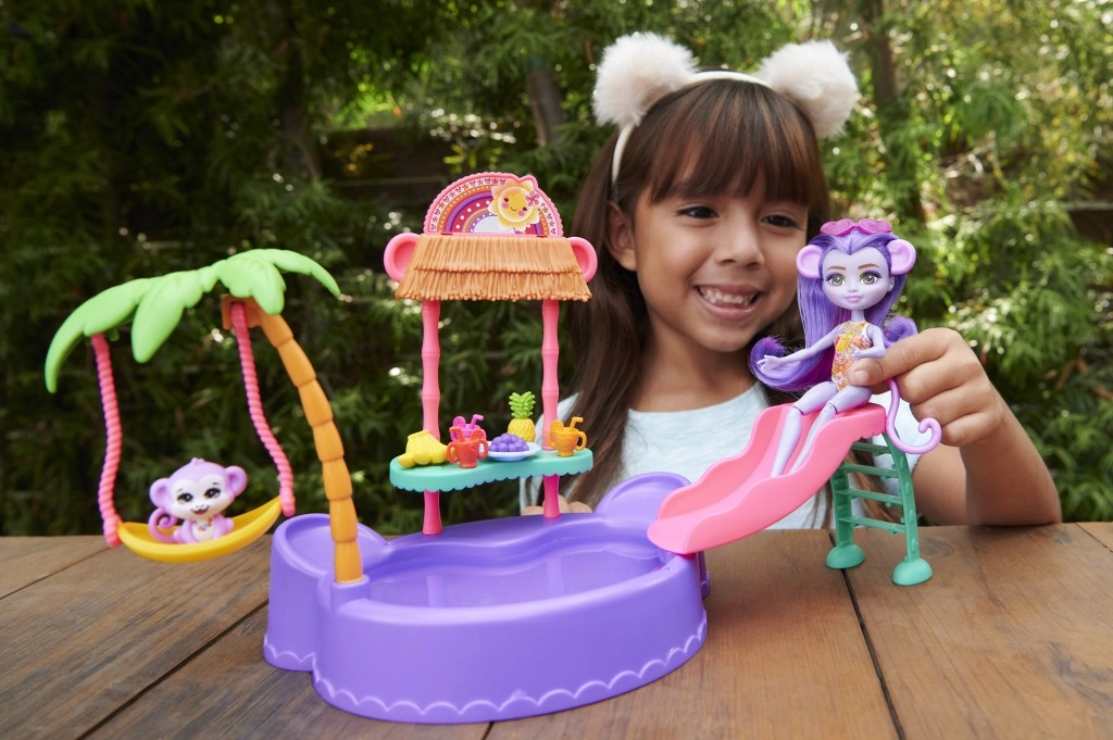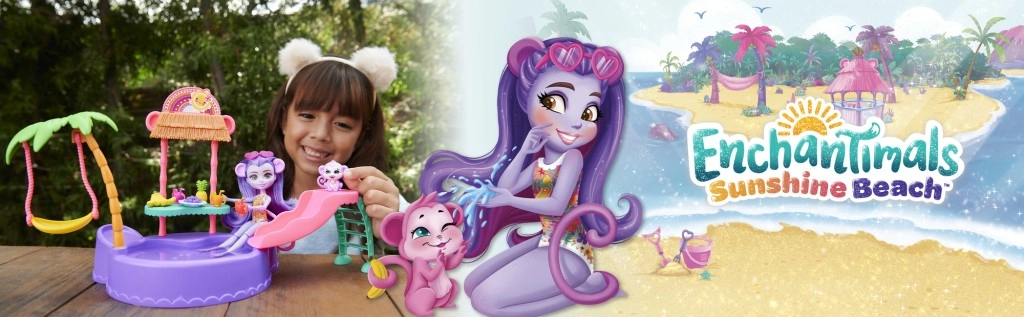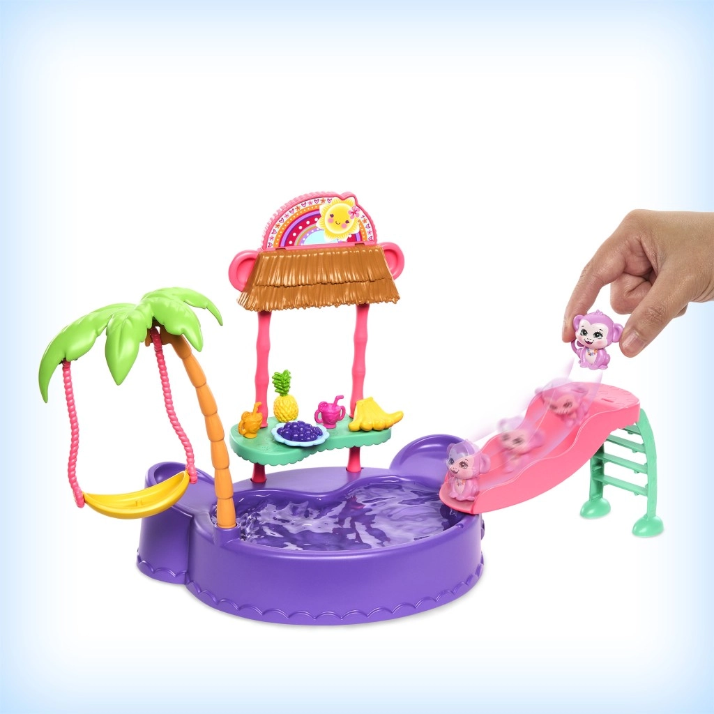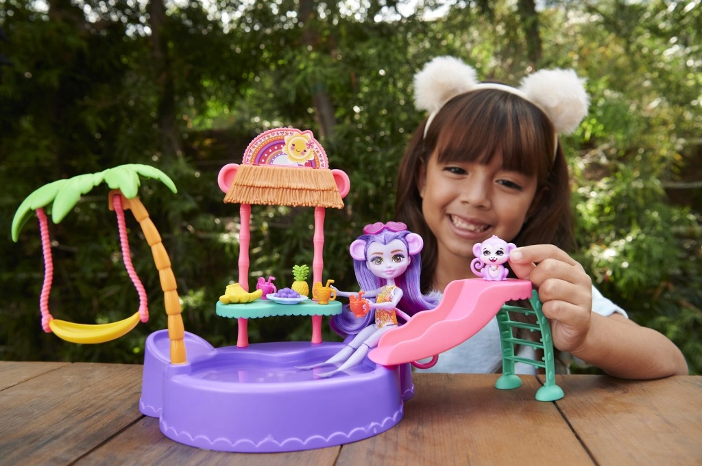 Ta barvit igralni set ENCHANTIMALS prinaša vzdušje plaže naravnost v otroško sobo. Punčka z vgrajenimi kopalkami in sončnimi očali v obliki srčka je pripravljena na dan, poln sonca, kopanja in dobrot s stojnice. Opička se lahko ziba na palmi ali se spušča po toboganu naravnost v bazenček.