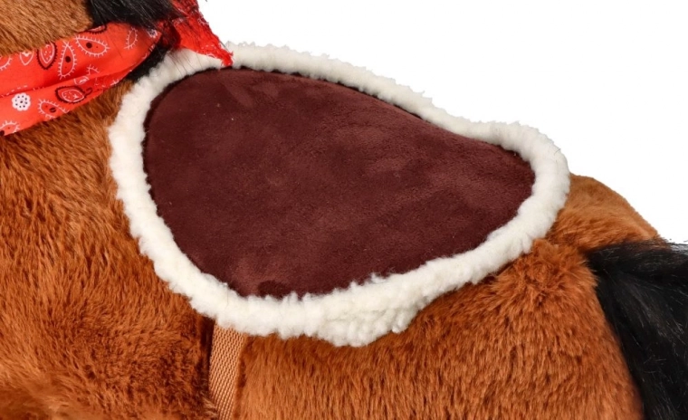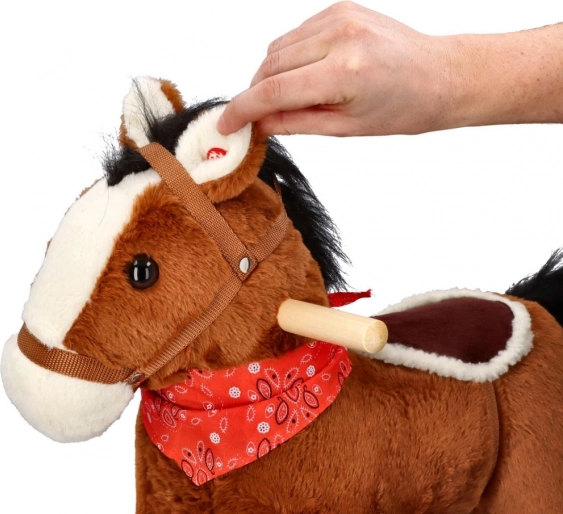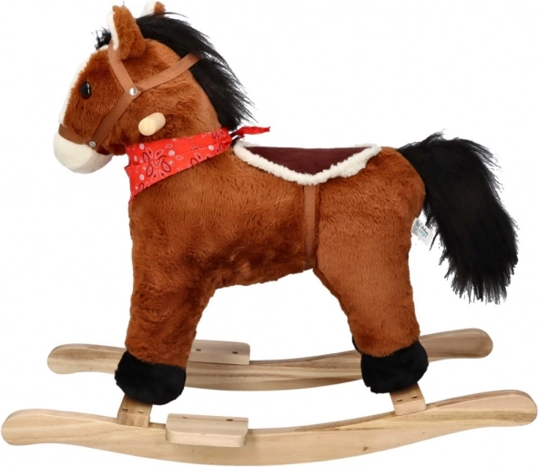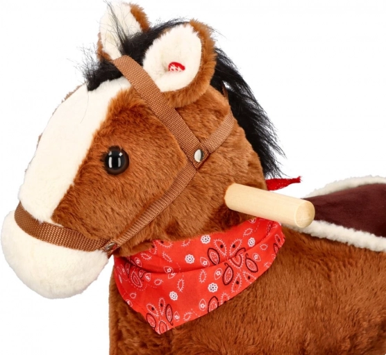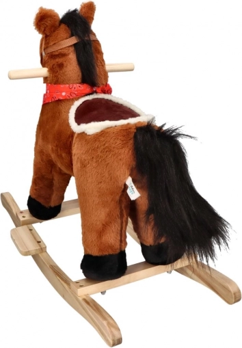 Gugalni konjiček v rjavi barvi z mehko plišasto površino, sedežem in okrasno ruto je idealen spremljevalec za vsakodnevno igro. Zahvaljujoč trdnemu lesenemu podnožju se otrok lahko varno guga, razvija motoriko in vadi koordinacijo.
