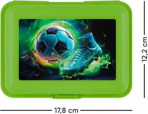 Ohranite malico svežo in pregledno organizirano. Ta zelena škatla z atraktivnim nogometnim dizajnom je odlična za otroke in odrasle, ki cenijo enostavno uporabo in zanesljivo zapiranje.