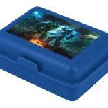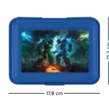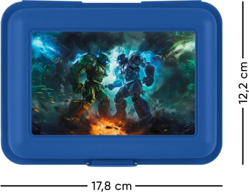 Predstavljamo inovativno škatlo za malico za vse ljubitelje znanstvene fantastike in robotov. Ta modra plastična škatla za malico združuje slog in praktičnost. Opremljena je z varnim zapiranjem z eno zaponko, ki zagotavlja, da vaša hrana ostane zanesljivo shranjena. S pomočjo razdelilnih pregrad lahko preprosto ločite različne vrste jedi za čisto in urejeno kosilo.