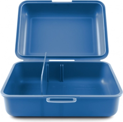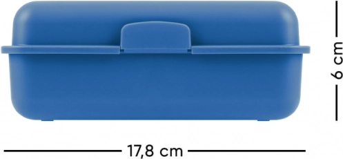 Modra plastična škatla ima dimenzije 17,8 cm x 12,2 cm, zaradi česar je idealna za udobno prenašanje in shranjevanje hrane.