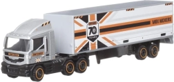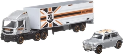 Vlačilec s prikolico in avtomobilček tvorita akcijski dvojec za prevozne in logistične scenarije. Kabino je mogoče odklopiti, komplet meri približno 17,5 cm.