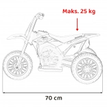 Enostavno upravljanje z vožnjo naprej ter zvočni učinki trobente in zagona prikličejo nasmeh na obraz vsakega malega ljubitelja motokrosa. Zaradi kompaktnih dimenzij (d. 70 × š. 41 × v. 50 cm) in teže le 4,6 kg je motor preprosto prenosljiv in primeren za otroke z največjo obremenitvijo do 25 kg.